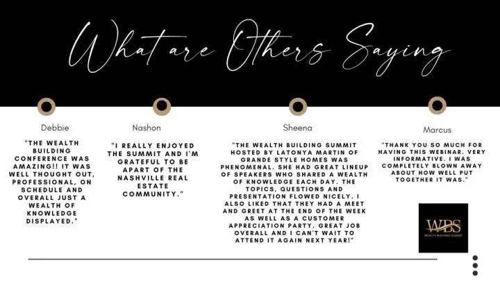 I look forward to seeing you at our Upcoming Summit! Learn from experts in real estate, developing, building, investing, credit, financing and more. Gain tools to build wealth, grow your income, and create a lasting legacy. Donβt miss this chance to be inspired, empowered, and financially prepared for your future!